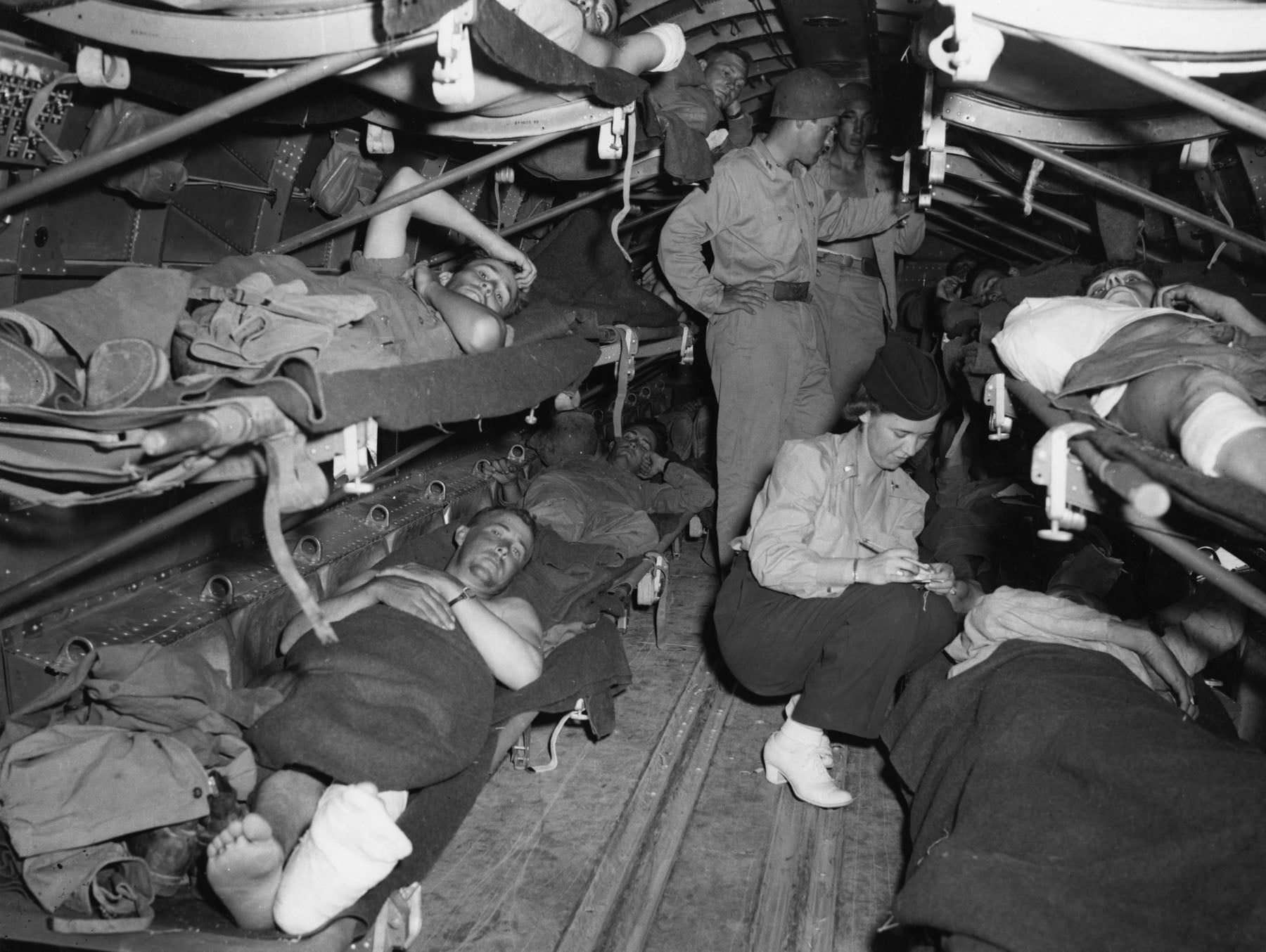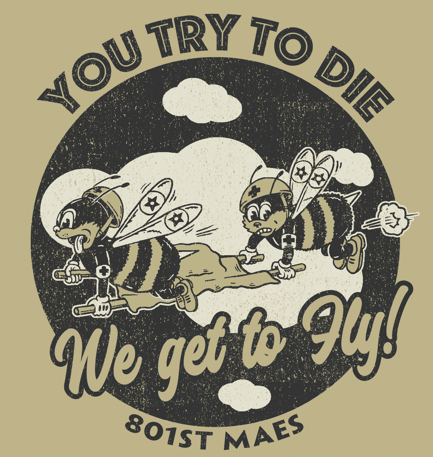 Behind the Design: These litter-carrying honey bees were born in 1942 at Bowman Field, Kentucky, the first Army Air Forces training base for flight nurses and medics. The 801st Medical Air Evacuation Squadron, the first AE group trained, was sent to the North African combat zone during WWII to treat and evacuate war casualties.